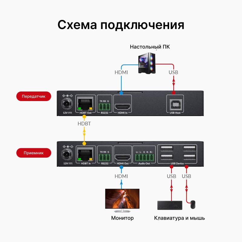 Устройство передает несжатый HDMI-сигнал по одному кабелю Cat6/6A/7 на расстояние до 100 метров с нулевой задержкой, обеспечивая стабильную работу на больших расстояниях для профессиональных AV-инсталляций.