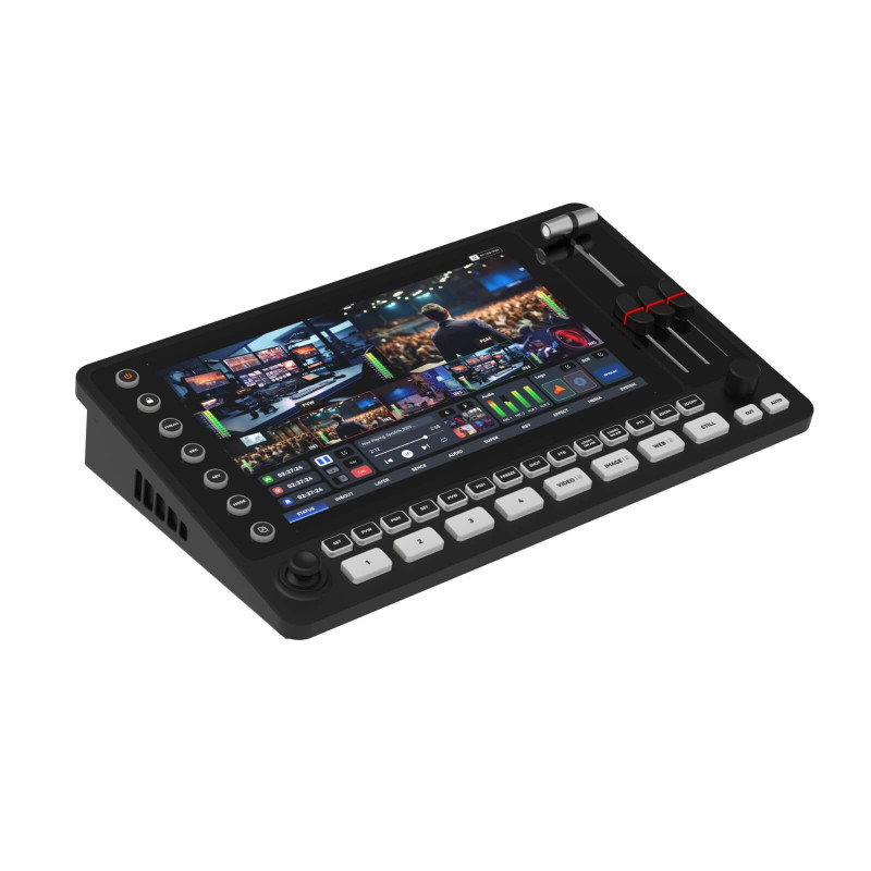 Видеомикшер с 4 входами HDMI 2.0 и 4 входами 3G-SDI, поддерживающий разрешение до 4K. Оснащен 10.1-дюймовым сенсорным экраном, двумя XLR-аудиовходами и функцией потоковой трансляции RTMP. Обеспечивает вывод через HDMI, 3G-SDI и USB-C с поддержкой UVC.