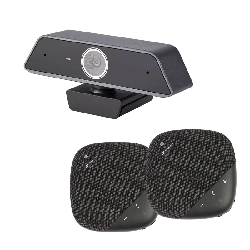Комплект включает веб-камеру с углом обзора 92° для съемки в 4K и два спикерфона с массивом из восьми микрофонов для захвата звука на 360°.
