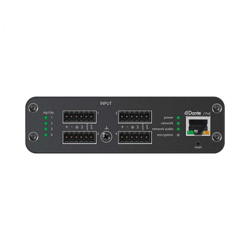 Сетевой аудиоинтерфейс с четырьмя аналоговыми входами для преобразования сигналов в цифровые каналы Dante. Частотная характеристика 20-20000 Гц, динамический диапазон 113 дБ, фантомное питание +48 В на каждый канал. Питание осуществляется через PoE.