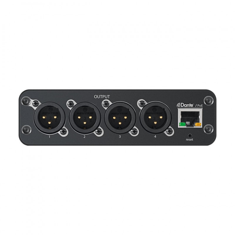 Сетевой аудиоинтерфейс с четырьмя аналоговыми выходами XLR для преобразования цифровых каналов Dante в аналоговые сигналы. Частотная характеристика 20-20000 Гц, динамический диапазон 117 дБ, максимальный уровень выхода +20 дБВ. Питание осуществляется через PoE.
