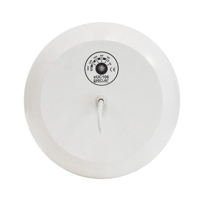eUC106WH – подвесная двухполосная акустическая система 6,5'' мощностью 40 Вт в корпусе сферической формы. Оснащена линейным трансформатором 100 В с отводами мощности на 32, 16, 8 и 4 Вт. Круговая диаграмма направленности делает эту АС идеальным решением для озвучивания больших площадей. Угол раскрытия АС приведен в технической документации.